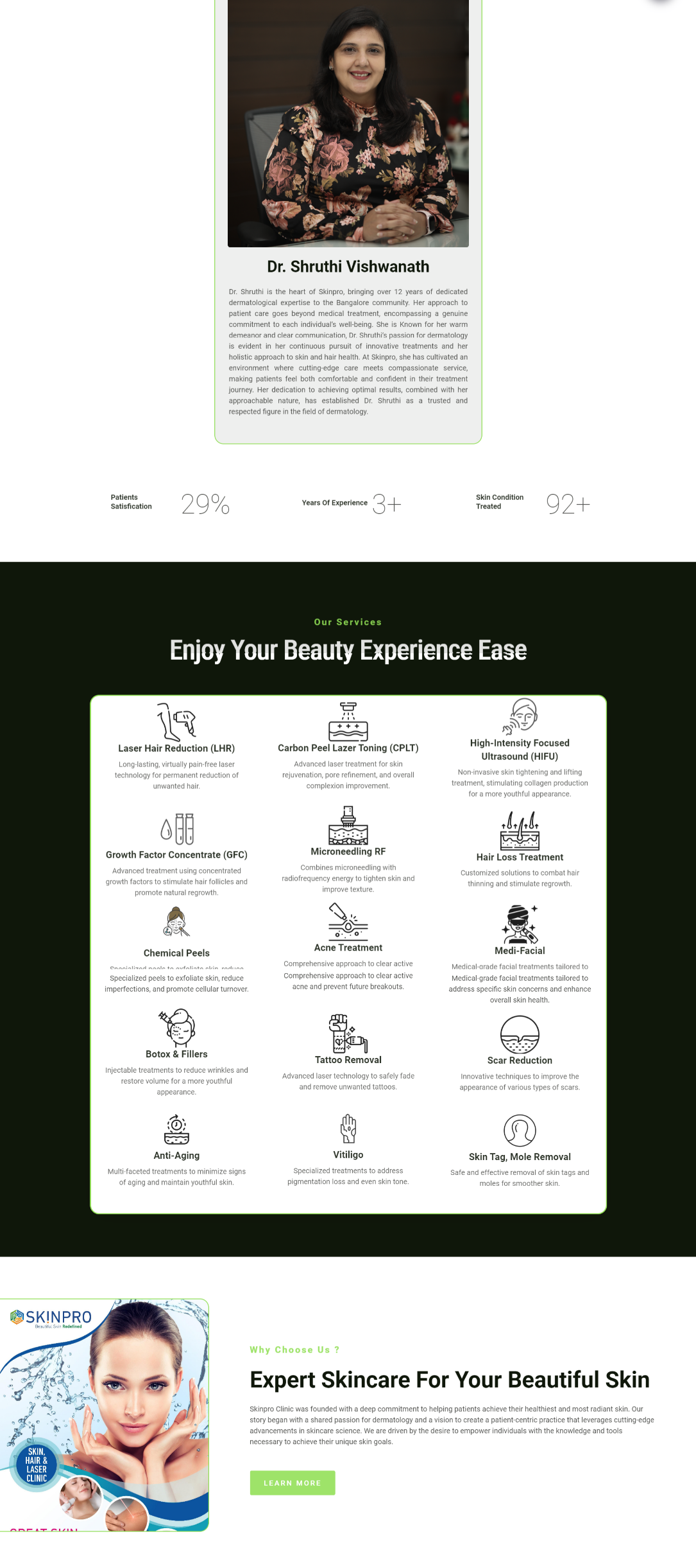 SkinPro Dermatology and Cosmetology Clinic specializes in advanced skincare and cosmetic treatments. They required a comprehensive digital presence to showcase their services, build credibility, and offer an effortless patient experience. Our goal was to create a website that reflects the clinic’s focus on cutting-edge dermatological care, supported by high-quality visual content and seamless functionality.